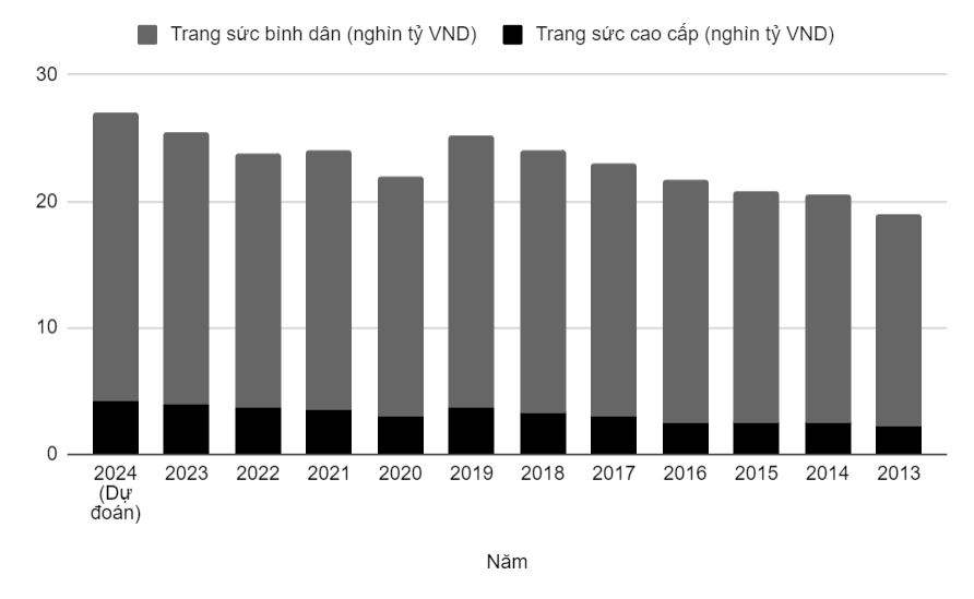 | Năm | Trang sức cao cấp (nghìn tỷ VND) | Trang sức bình dân (nghìn tỷ VND) |