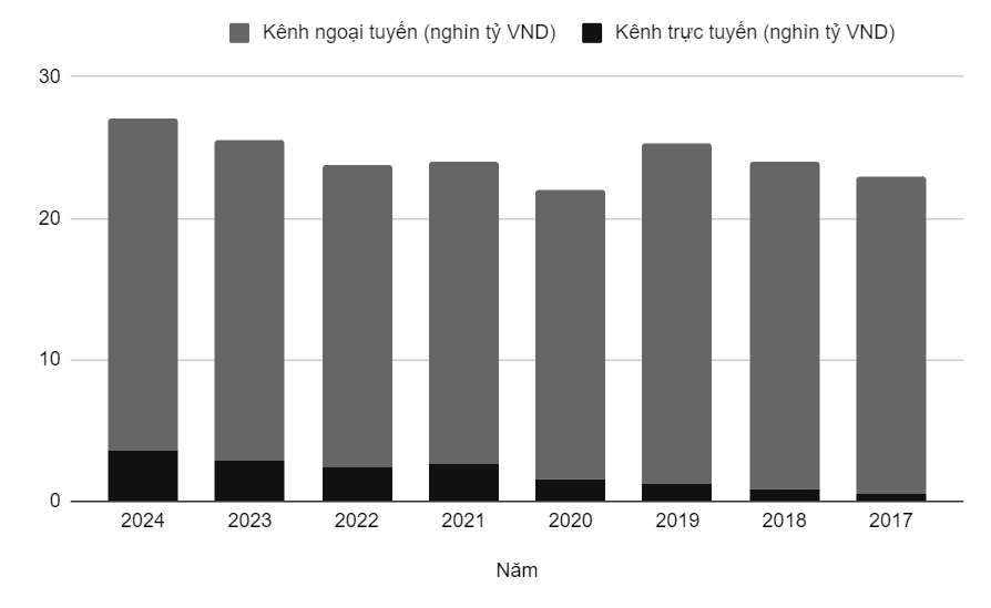 | Năm | Kênh trực tuyến (nghìn tỷ VND) | Kênh ngoại tuyến (nghìn tỷ VND) |