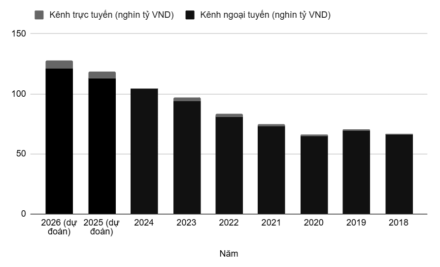 | Năm | Kênh ngoại tuyến (nghìn tỷ VND) | Kênh trực tuyến (nghìn tỷ VND) |